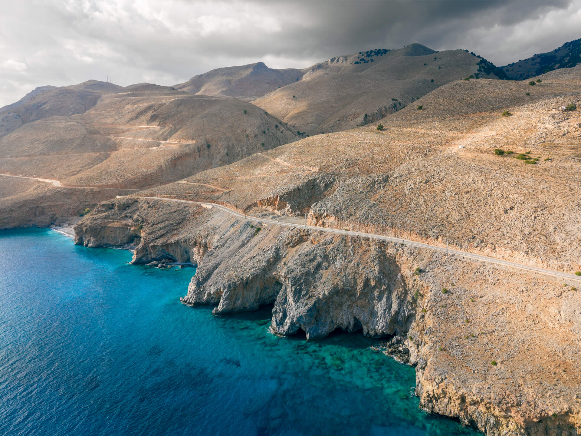 Captured near Chora Sfakion on Crete’s south coast, this fine art aerial photograph reveals a rugged shoreline shaped by wind, sea, and time. The sweeping cliffside road emphasises the region’s isolation and raw beauty, offering a calm yet powerful view of the island’s untouched nature. Ideal for interiors seeking a sense of spaciousness, serenity, and Mediterranean character.